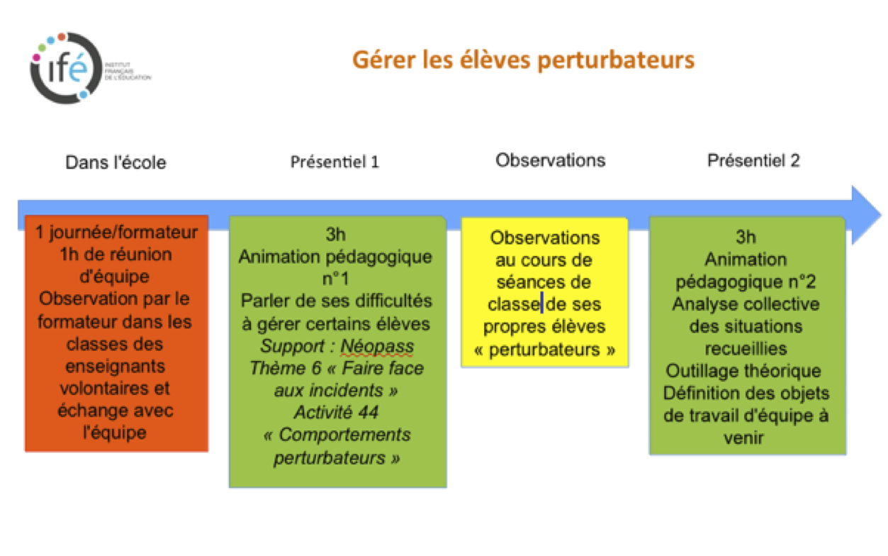 - de préparer l’intersession pour permettre à chaque enseignant de se mettre en situation d’observation de ses propres élèves perturbateurs sans avoir à conduire la classe en même temps (au moins une fois, en fonction des ressources de l’école et de la circonscription).