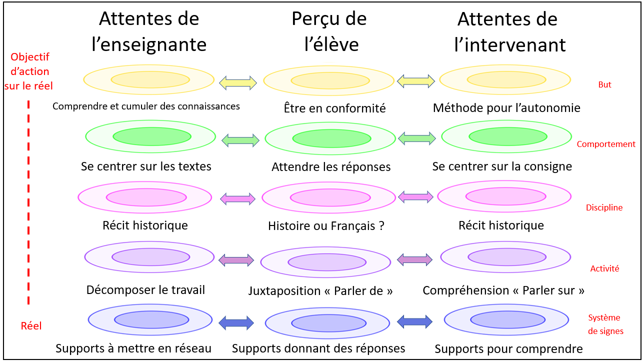 Accéder aux enjeux de savoir est souvent difficile pour les élèves, car spontanément ils cherchent à faire correspondre tous les signes qu’ils vont percevoir avec ce qu’ils pensent déjà comme à priori. Or à l’École, apprendre, c’est transformer son rapport aux objets culturels. Cela passe par l'étude d'un objet en le mettant à distance Bautier Elisabeth, Goigoux Roland. Difficultés d’apprentissage, processus de secondarisation et pratiques enseignantes : une hypothèse relationnelle. In: Revue française de pédagogie, volume 148, 2004. pp. 89-100. DOI : https://doi.org/10.3406/rfp.2004.3252 www.persee.fr/doc/rfp_0556-7807_2004_num_148_1_3252 . Cela implique pour l'enseignant d'agir sur ce que perçoit et structure l'élève sur chacune des dimensions. La difficulté majeure du métier est alors de chercher à identifier tout ce qui peut sembler évident, mais qui est invisible et potentiellement source de malentendu.
