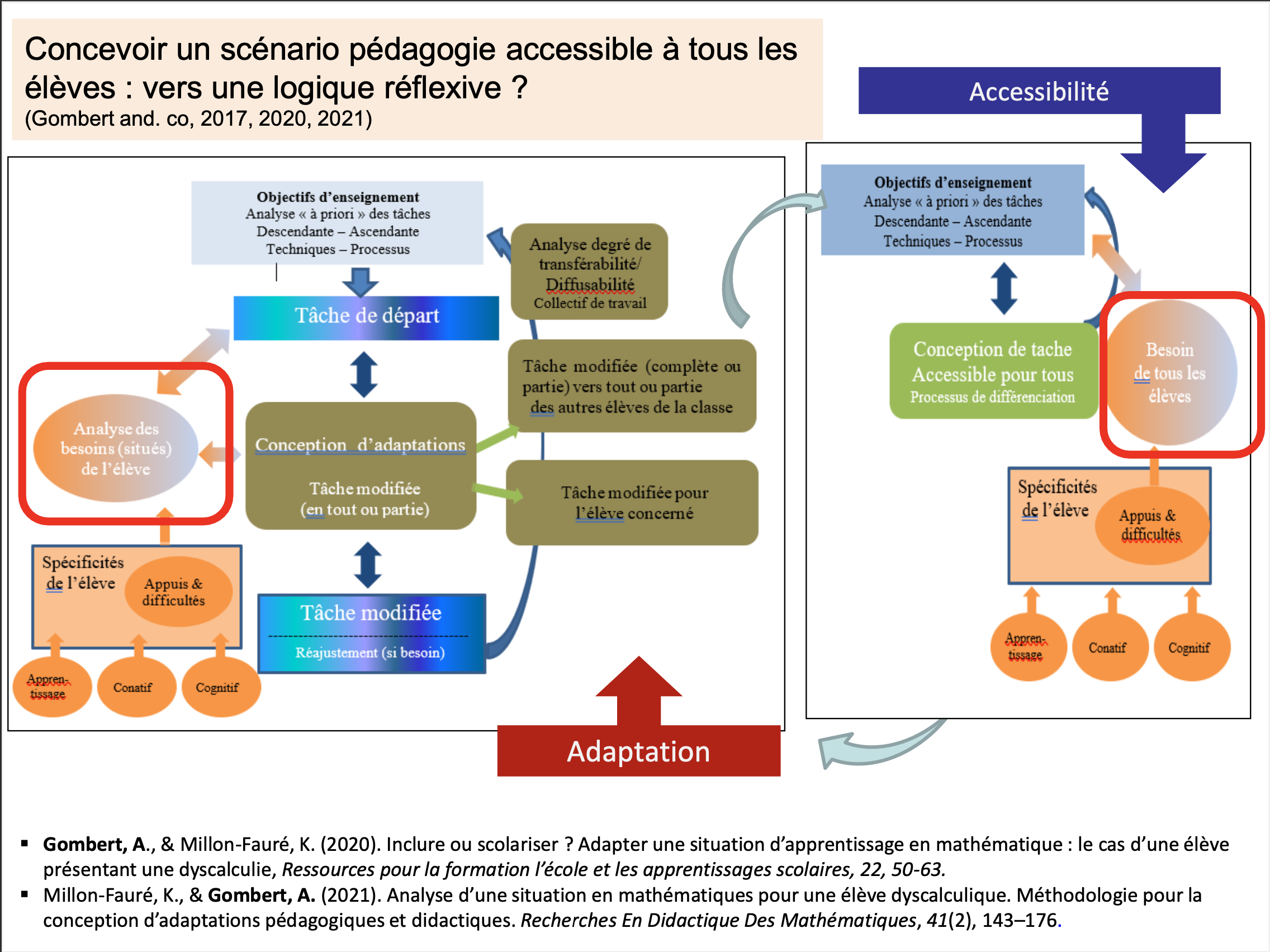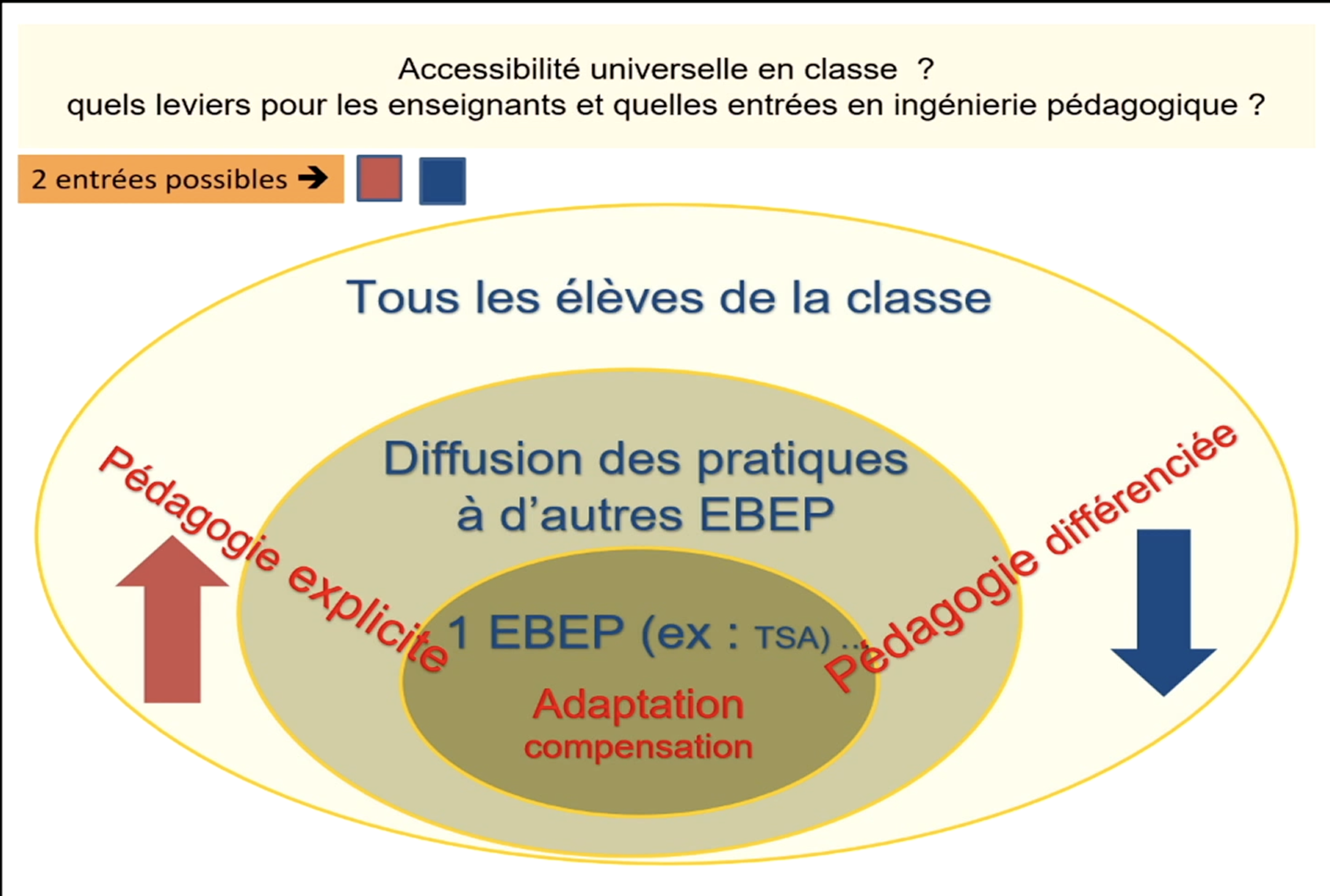 Le paradigme inclusif, de mise depuis 2005, focalise sur le besoin de l'individu qui serait particulier. Or les travaux de recherche ont pu démontrer que ces adaptations conçues par les enseignants pour les Élèves à Besoins Éducatifs Particuliers (EBEP) sont transférables à l'ensemble des élèves et orienteraient vers une pédagogie universelle. Ainsi depuis 2019, le paradigme universaliste permet de penser les environnements pédagogiques et didactiques comme accessibles à tous en enlevant en amont l'ensemble des obstacles aux apprentissages. Dans ce paradigme, l'adaptation se penserait in fine, si l'environnement n'était pas encore suffisamment accessible.