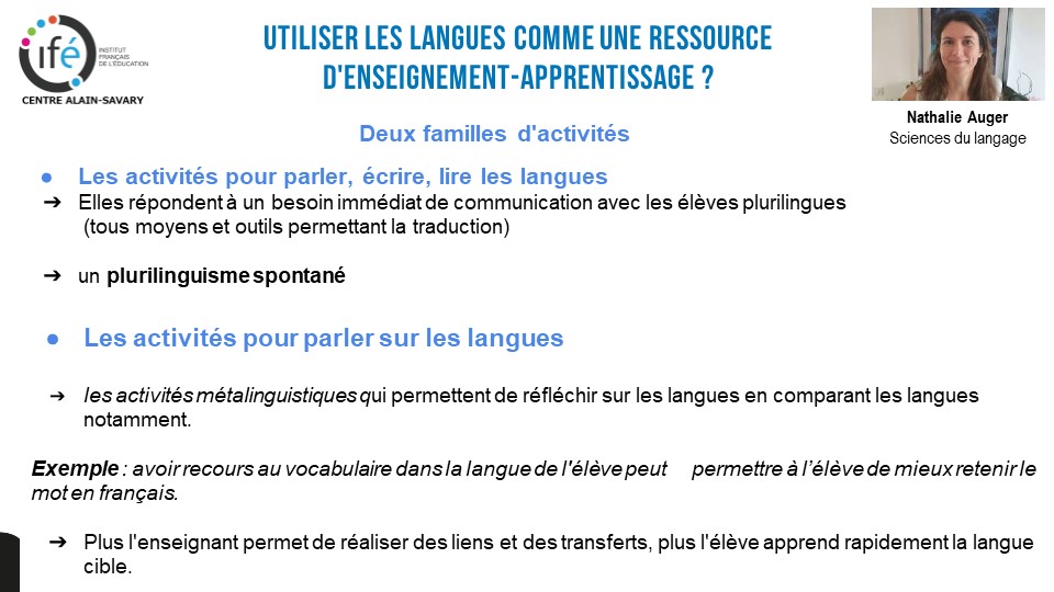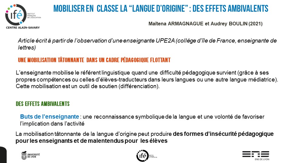 Des apports pour faire discuter ce que l'on gagne à autoriser l'emploi des langues des élèves ( A.Young et L.Mary) et aussi les points de vigilance (M.Armagnague et A.Boulin).