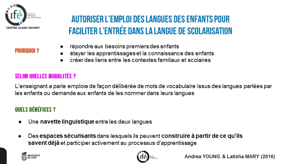 - Autoriser les élèves à mobiliser leurs langues tout en voulant que tous les élèves communiquent entre eux.