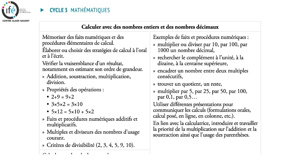 Les élèves doivent mémoriser des faits numériques et des procédures élémentaires de calcul à l'oral ou à l'écrit. Savoir multiplier par 10, 100,...